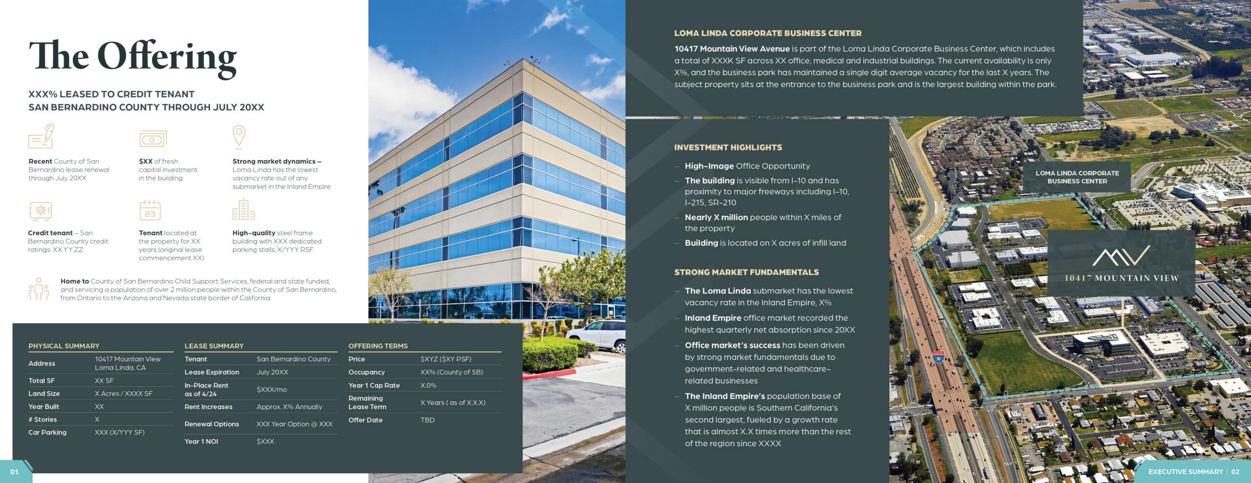 Spreads and branding direction geared towards marketing an industrial property in Loma Linda, CA. Color and tone taken from the property’s photos, alongside abstract elements aimed to feel “industrial but clean”.